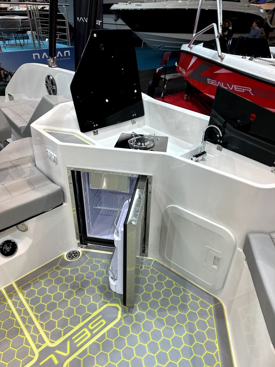 The WAVE BOAT 777, the new flagship of our rigid line, is a premium model with radical features: dynamic exterior lines, an ingenious deck layout that invites you to relax, resolutely focused on conviviality, generous on-board space, and a flexible deck layout that allows you to go from a convivial shaded saloon to a double table in a matter of seconds. For yachtsmen eager to open up new horizons. All this combined with a step hull that guarantees fast planing and an exhilarating ride.